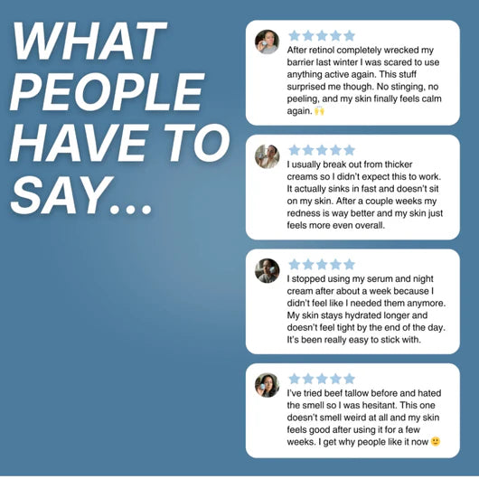 We use grass-fed beef tallow because it mirrors your skin's natural oils. absorbing fully, strengthening your barrier, and hydrating deeply without clogging pores.